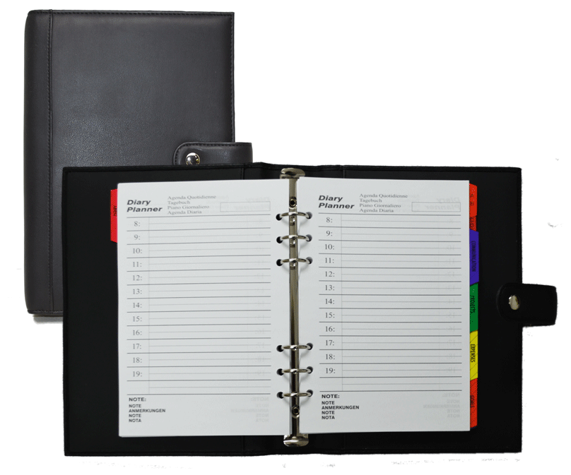 9 1/2" x 7" six-ring organizer, made of padded vinyl with edge stitching and a snap closure. The 8 1/4" x 5 1/2" insert pages include multi-language undated monthly and weekly planners, and mylar-tabbed sections for projects, expenses, etc. Mylar-tabbed address book, plus a document flap inside the front cover.